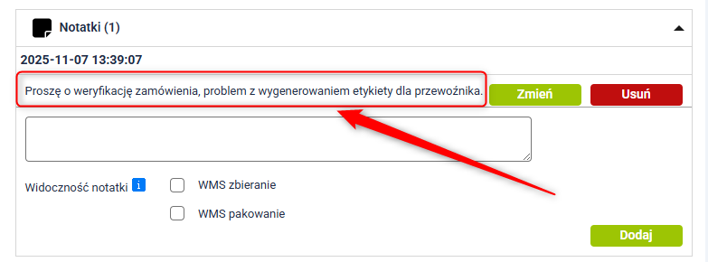 - automatycznie uzupełnić zamówienie o notatkę, np. że paczka została przygotowana na etykiecie zastępczej i wymaga późniejszego wygenerowania listu przewozowego,