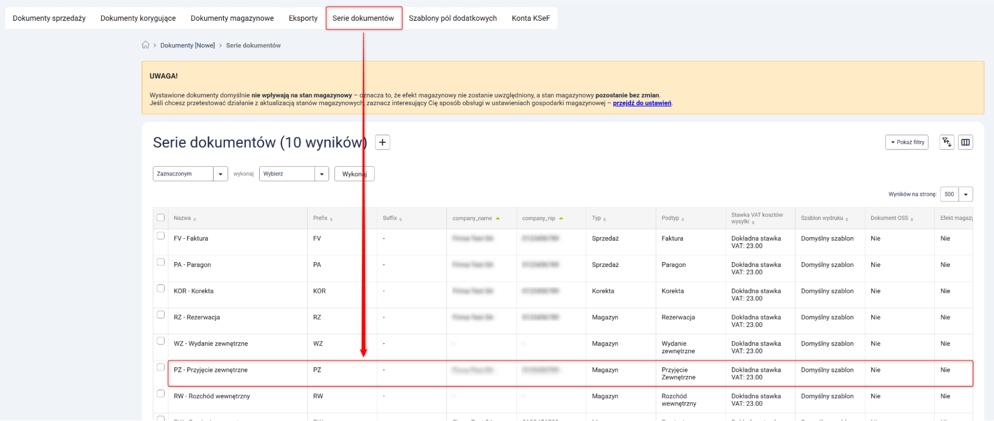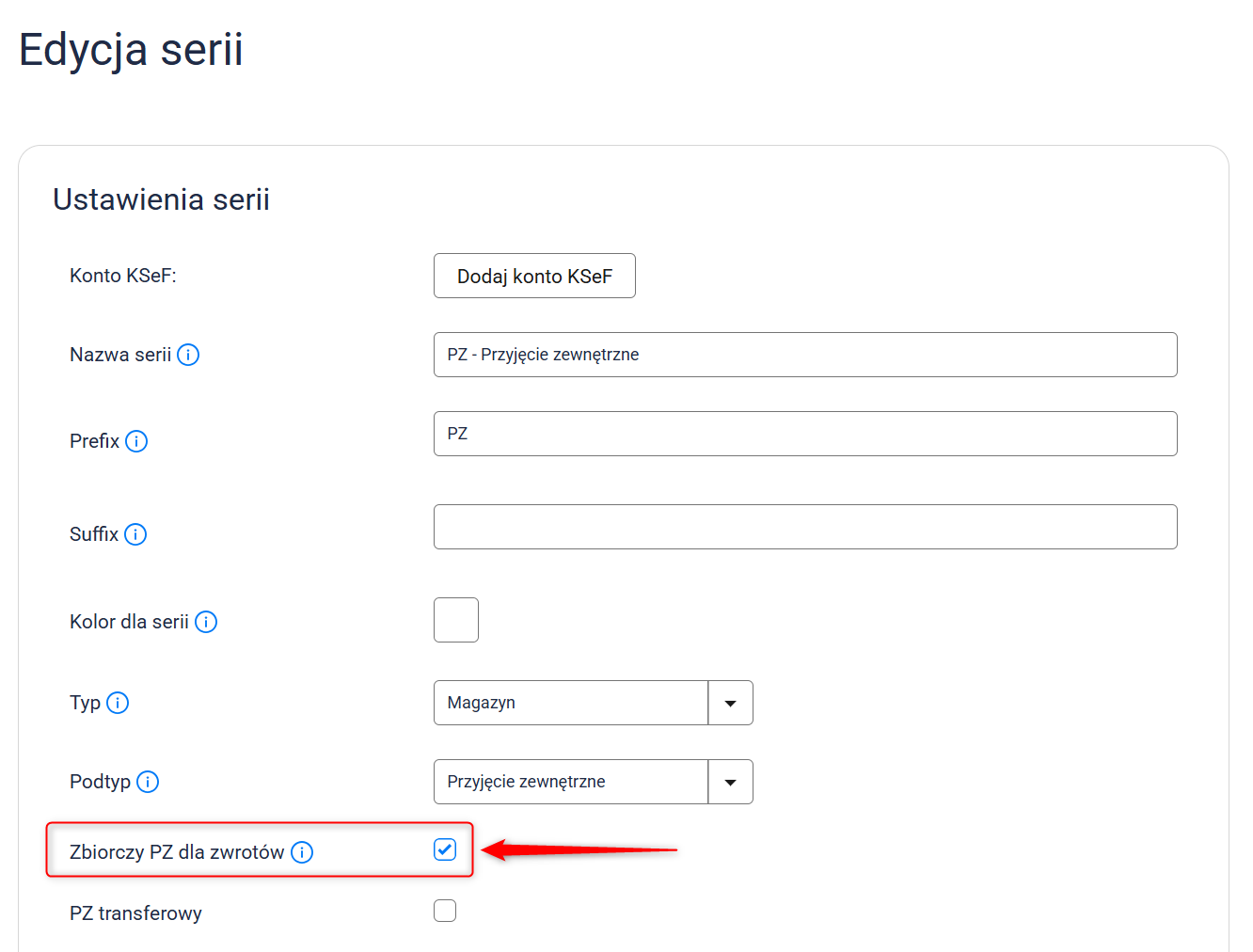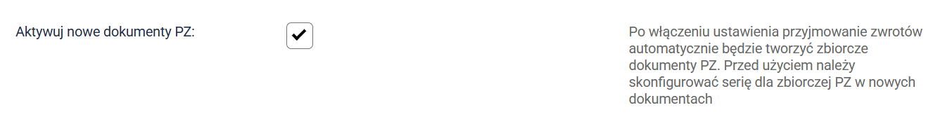 1. Przejdź do Dokumenty [Nowe] → Serie dokumentów → Wybrana seria PZ i w edycji serii zaznacz checkbox Zbiorczy PZ dla zwrotów.