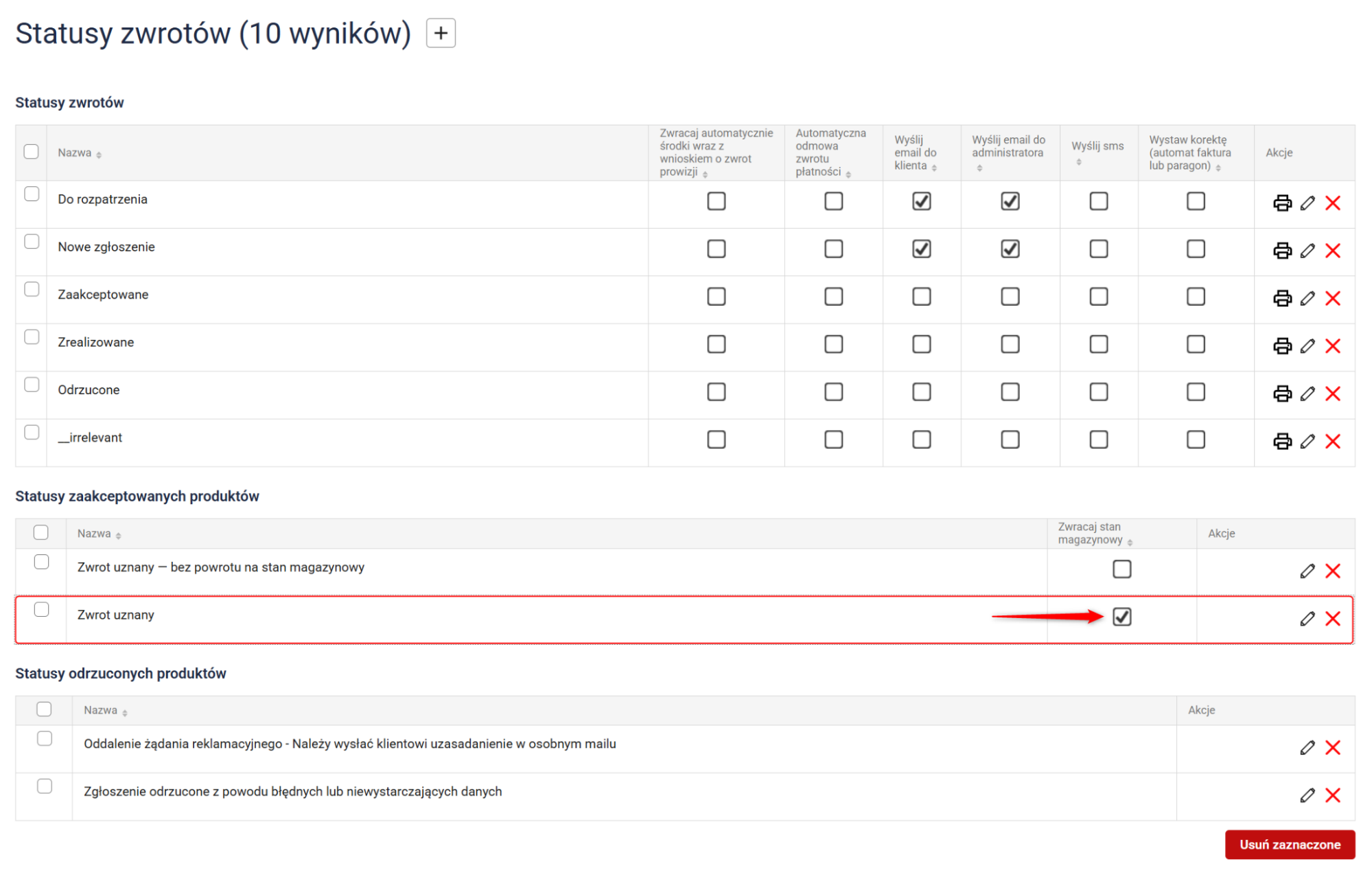 Uwaga: Pamiętaj, aby ustawiony status zwrotu posiadał zaznaczoną opcję zwrotu na stan magazynowy (Konfiguracja, punkt 2).
