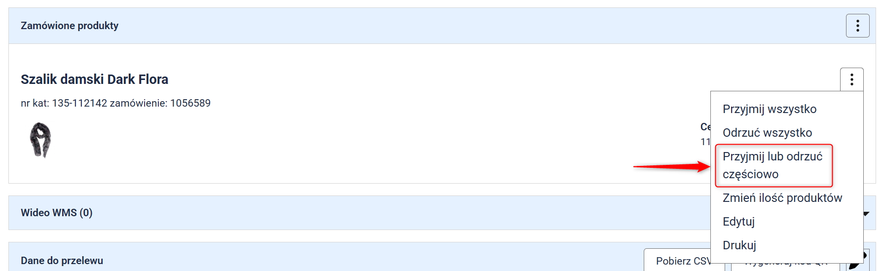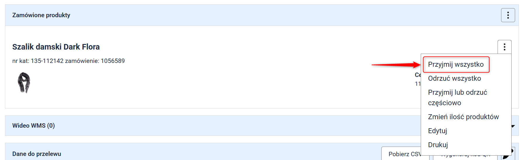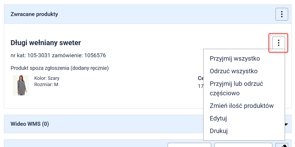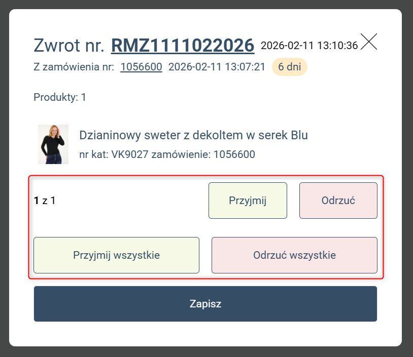3. Na karcie zwrotu pojawią się wybrane produkty. Kliknij przycisk Przyjmij lub odrzuć przy danym produkcie.