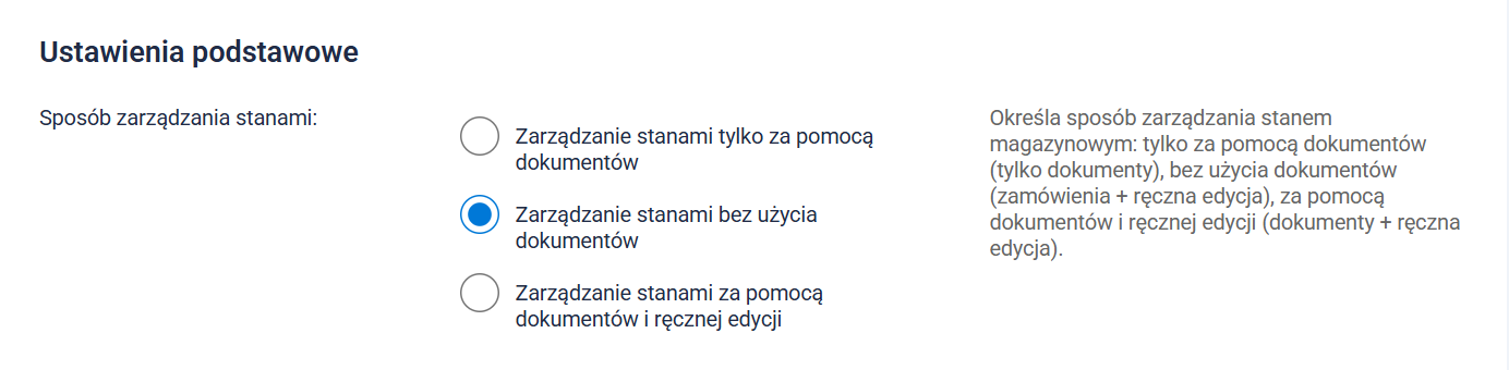 Wybór sposobu zarządzania stanami znajdziesz, przechodząc do Magazyn → Gospodarka magazynowa → Ustawienia (screen poniżej).