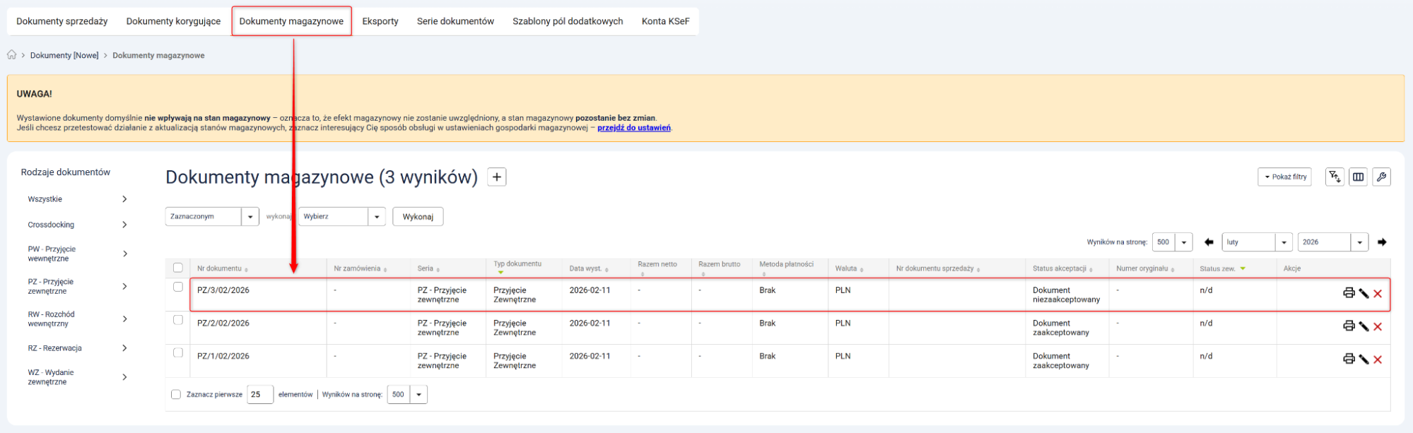 1. Przejdź do Dokumenty [Nowe] → Dokumenty magazynowe → Nowy, niezaakceptowany dokument PZ.