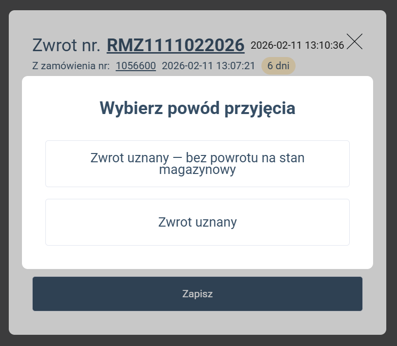 Proces przyjęcia zwrotu na magazyn opiera się na statusach zwrotów wybranych przez sprzedawcę. System każdorazowo weryfikuje, jaki status został ustawiony dla danego zwrotu.