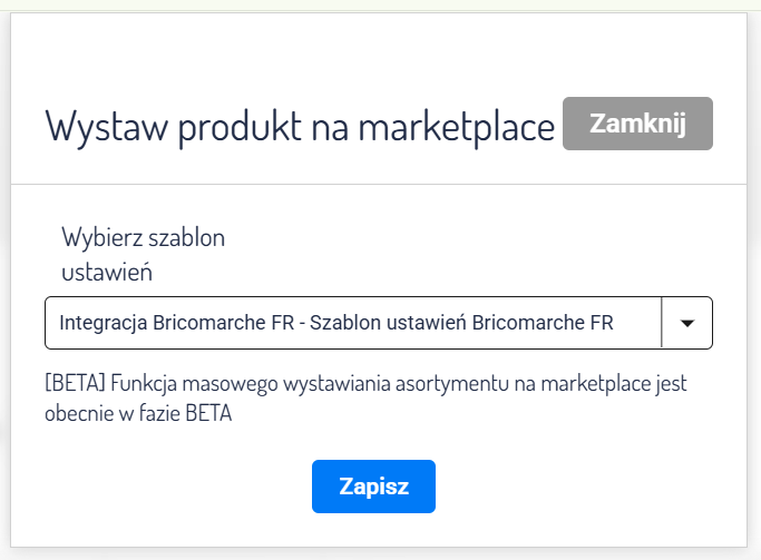 2. Na ekranie zobaczysz okno wyboru szablonu ustawień. Z rozwijanej listy wybierz Twój szablon Bricomarche FR i kliknij przycisk Zapisz.