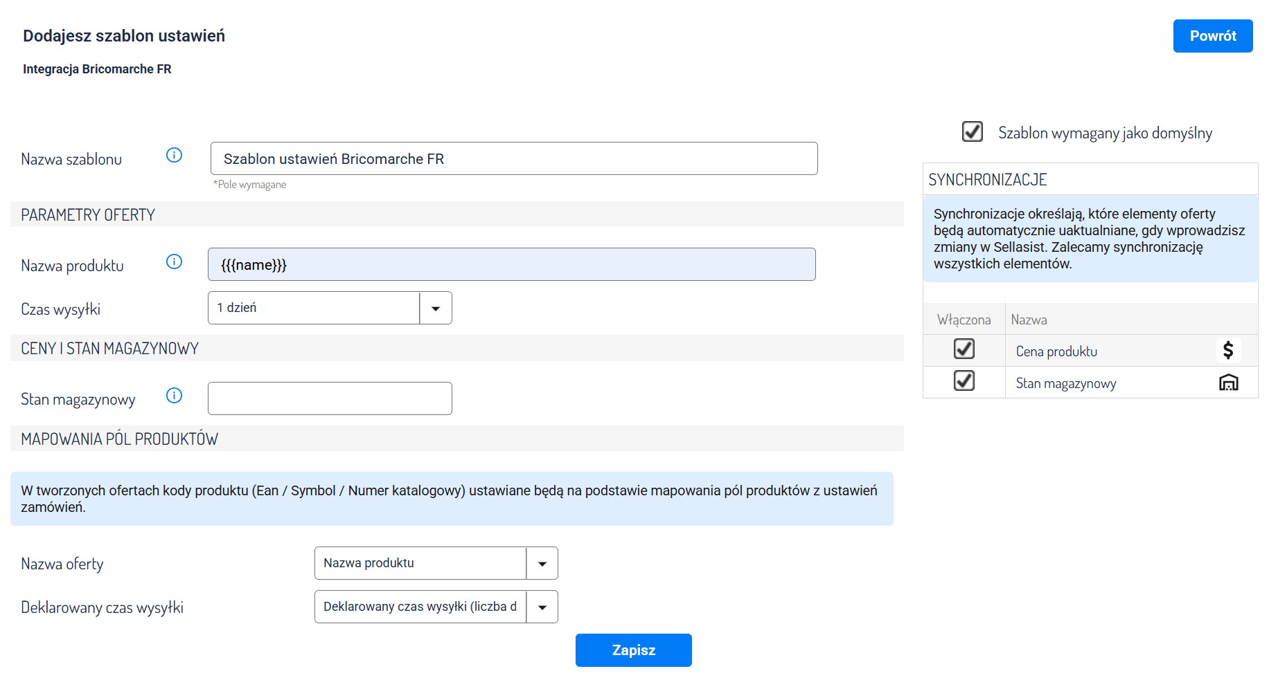 - Nazwa szablonu: Nazwa szablonu widoczna w panelu Sellasist.