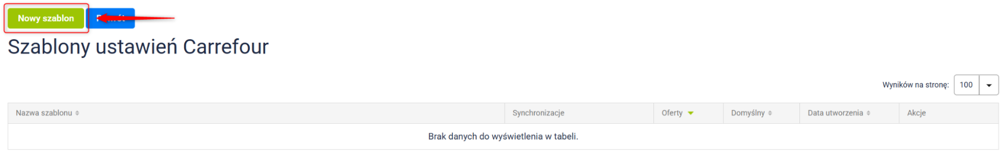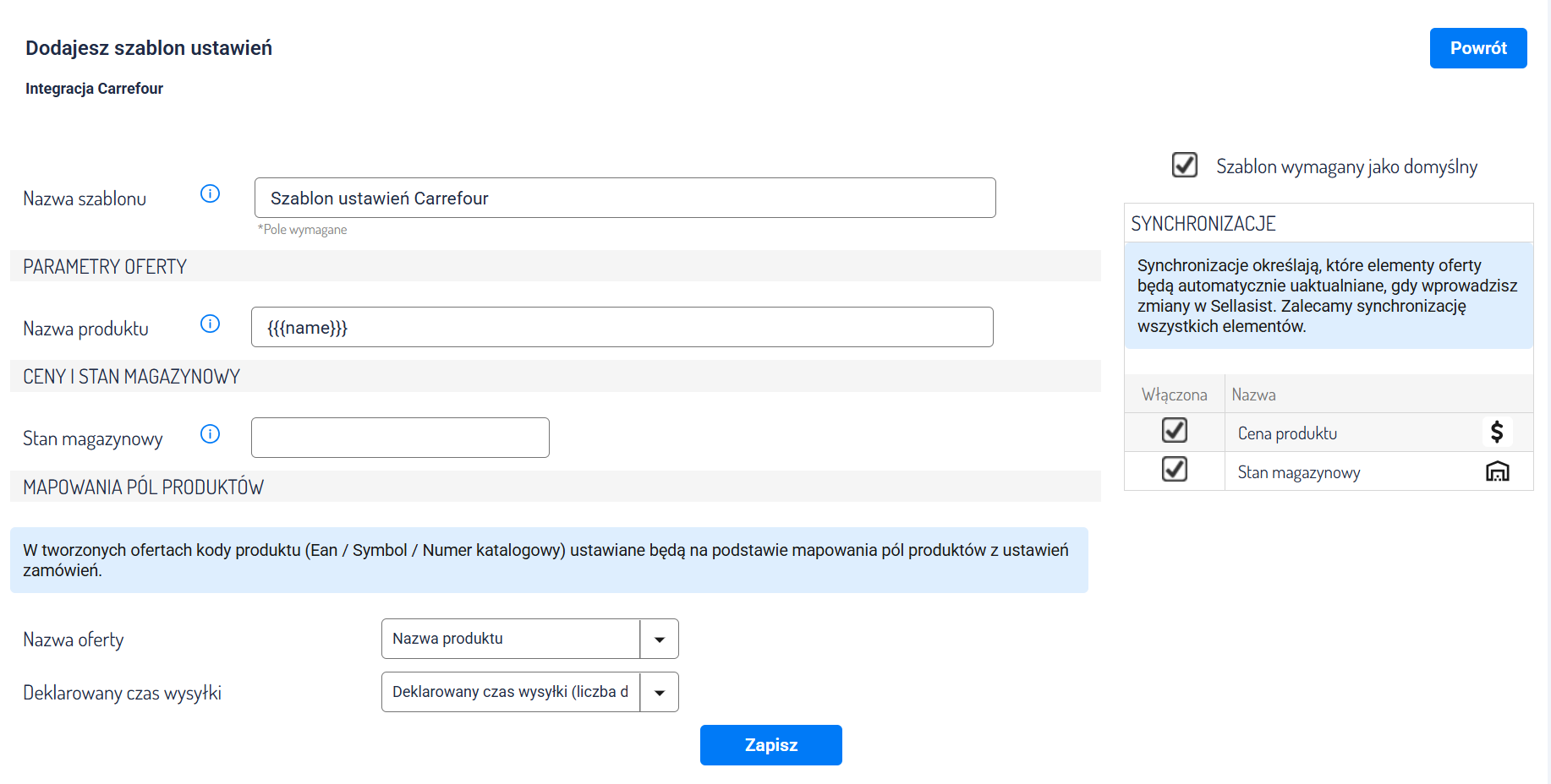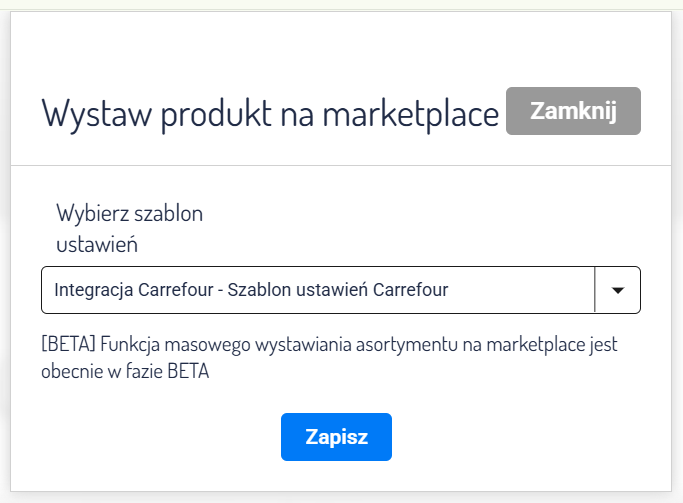 2. Na ekranie zobaczysz okno wyboru szablonu ustawień. Z rozwijanej listy wybierz Twój szablon Carrefour i kliknij przycisk Zapisz.
