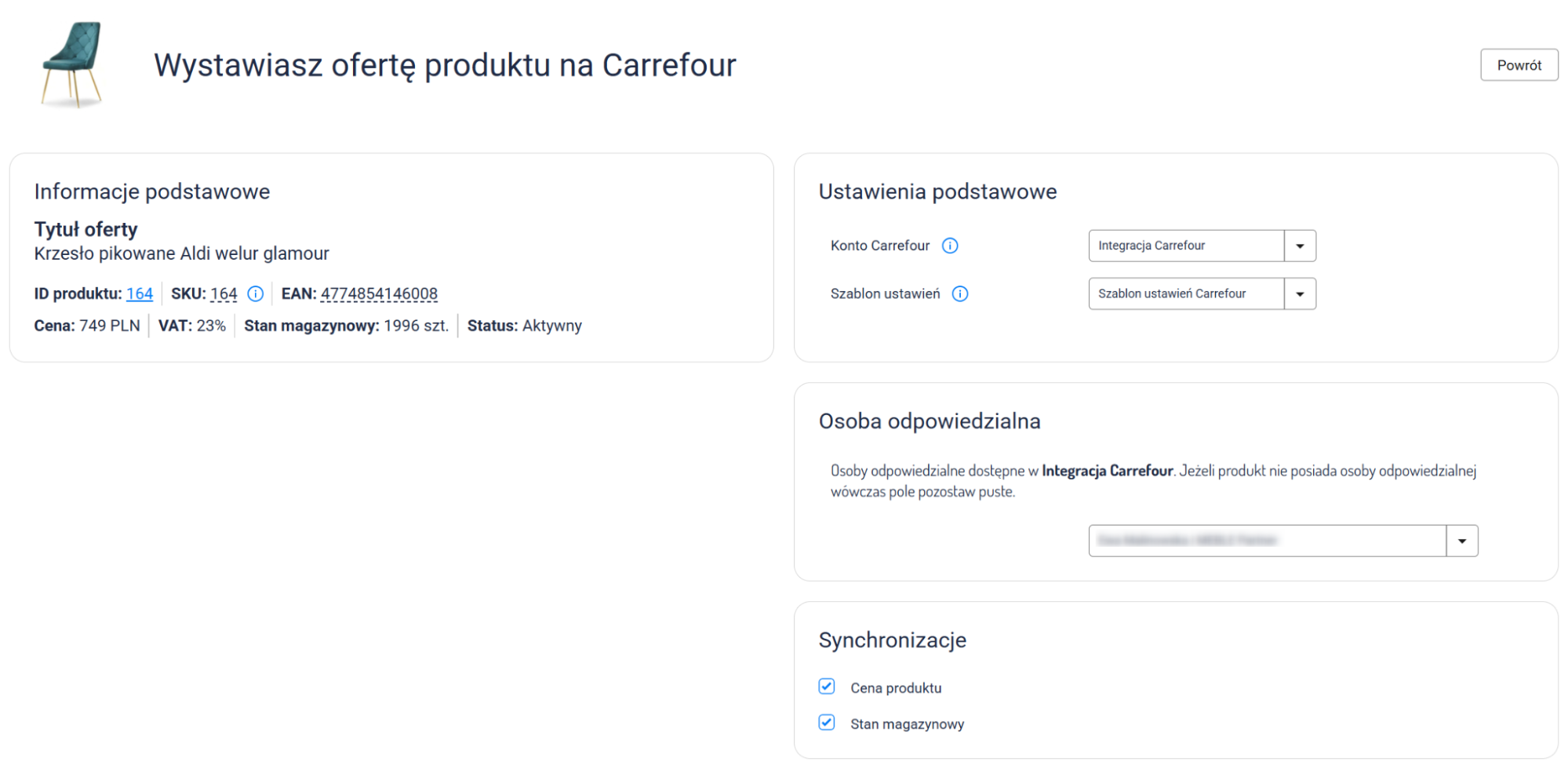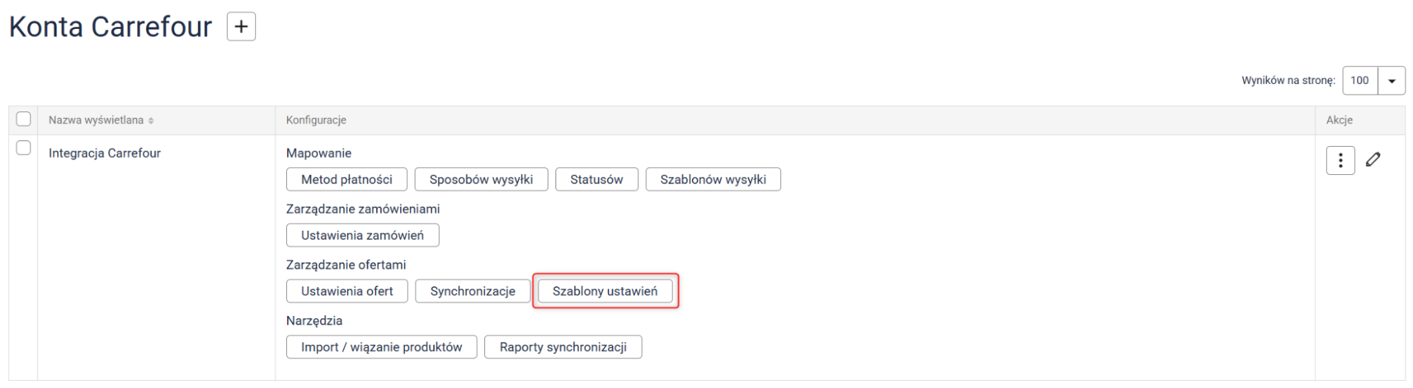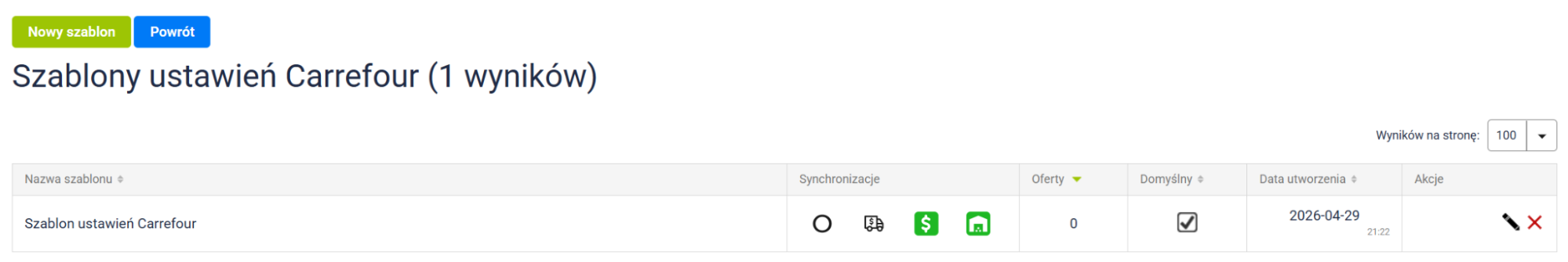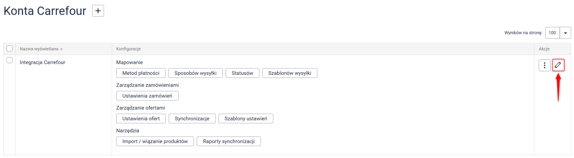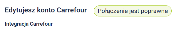 Zanim zaczniesz: Upewnij się, że integracja Carrefour jest poprawnie podłączona, a wszystkie ustawienia mapowania właściwie skonfigurowane. Aby sprawdzić status połączenia, przejdź do Integracje → Carrefour i kliknij ikonę ołówka. Prawidłowo skonfigurowane konto będzie zawierać komunikat o poprawnym połączeniu (screen poniżej). Jeśli jeszcze nie podłączyłeś konta Carrefour lub nie skonfigurowałeś mapowania, szczegółową instrukcję konfiguracji znajdziesz tutaj.