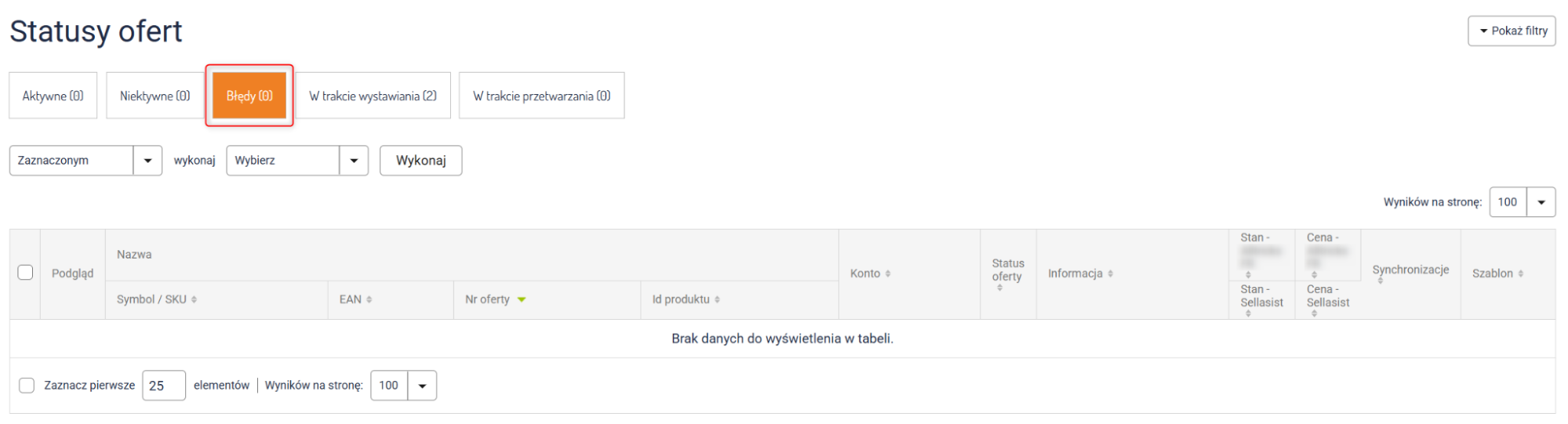 4. Jeśli z jakiegoś powodu oferta nie zostanie wystawiona, szczegóły zdarzenia znajdziesz w zakładce Błędy. Po wprowadzeniu wymaganych zmian, możesz ponowić wystawianie każdej takiej oferty.