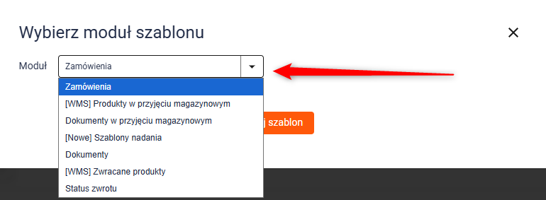 Moduł Zamówienia oznacza, że szablon wydrukujesz z poziomu listy zamówień. Dostępne są również [WMS] Produkty w przyjęciu magazynowym, [Nowe] Szablony nadania.