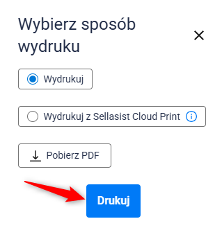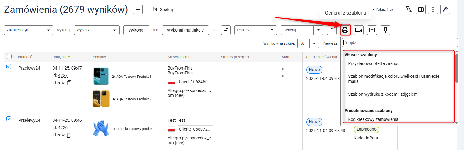 Na karcie zamówienia wystarczy kliknąć Generuj z szablonu i wybrać szablon, automatycznie zostaniesz przeniesiony do wyboru sposobu drukowania. Kliknij Drukuj by wydrukować.