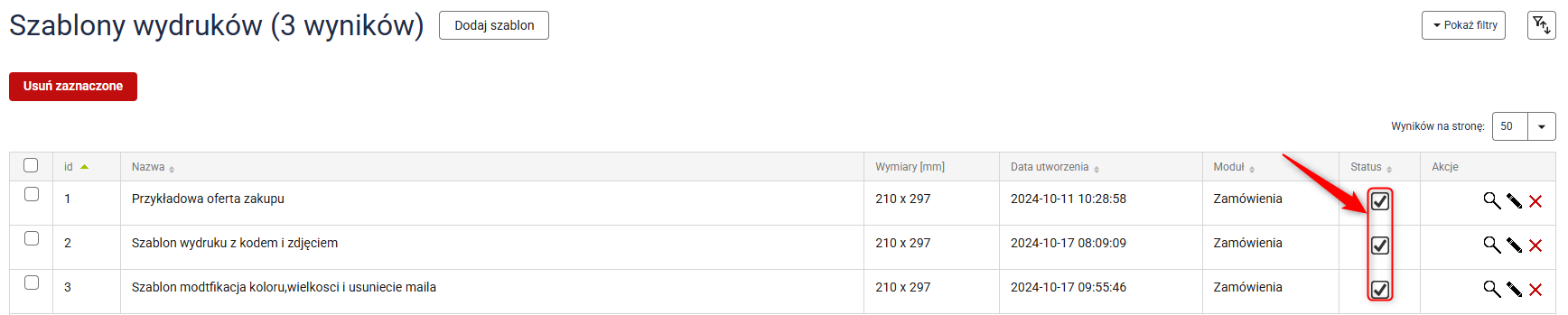 W dowolnym momencie możesz wyłączyć szablon, przechodząc do zakładki Administracja ⇨ Szablony wydruków i odznaczając okienko statusu.