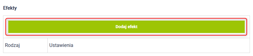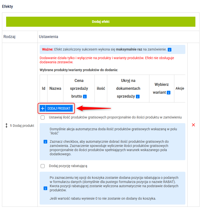 3. Na liście efektów pojawi się nowa pozycja — konfigurator automatycznego dodawania produktu. Kliknij przycisk Dodaj produkt.