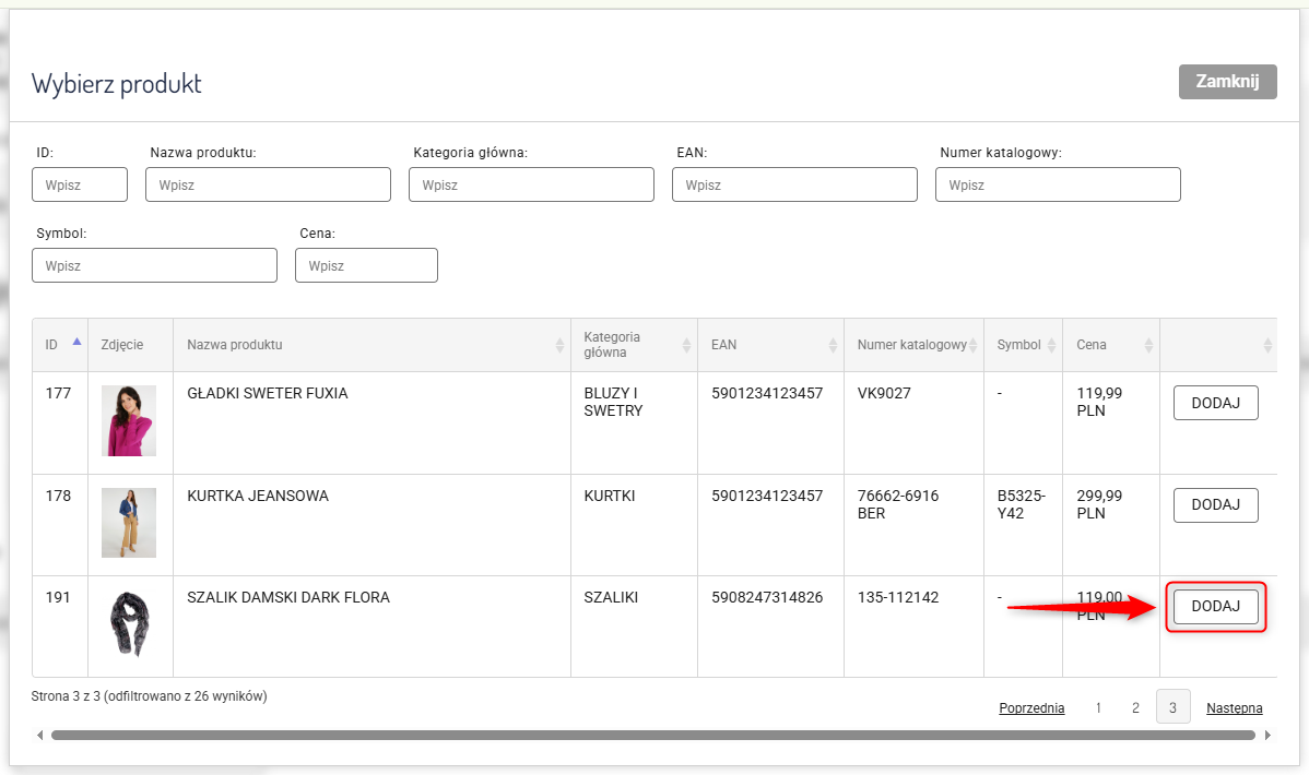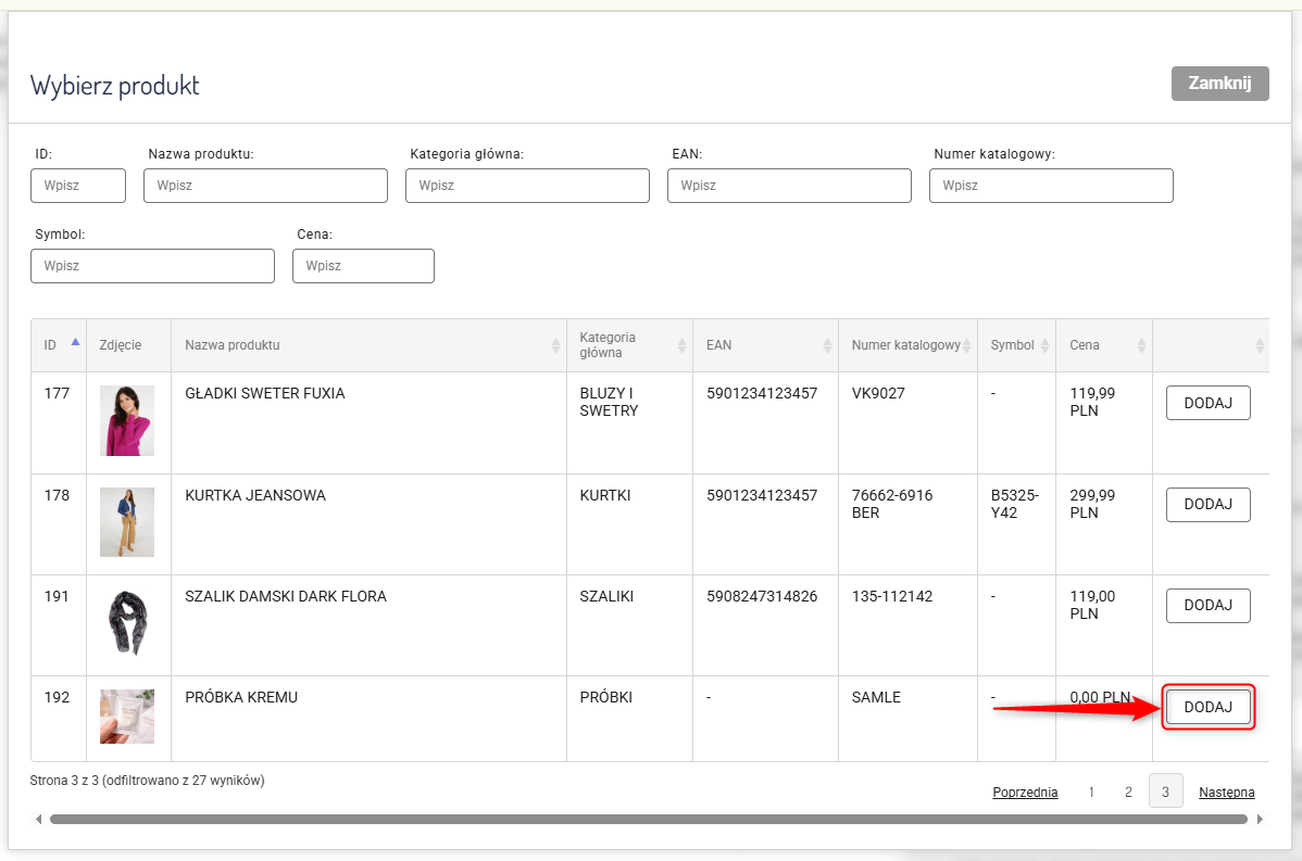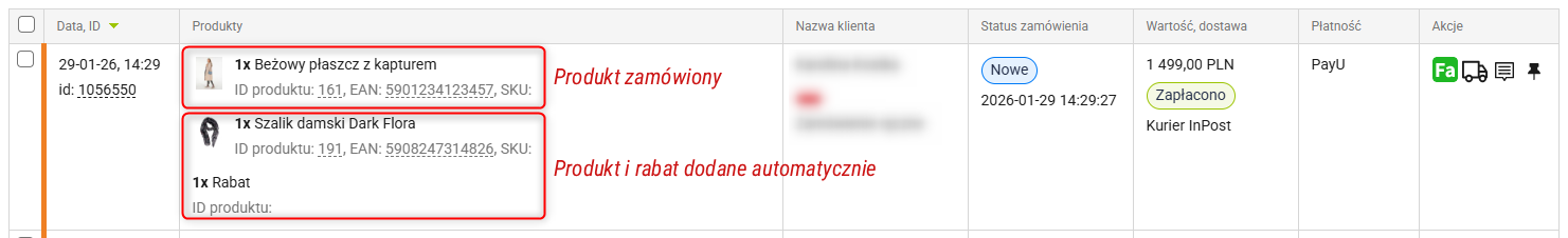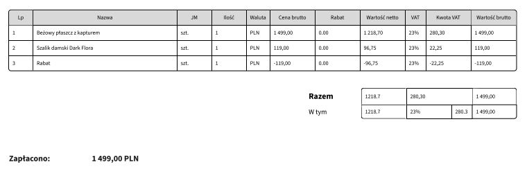System automatycznie doda pozycję Rabat, której wartość zrównoważy cenę dodanych produktów (np. Szalik o wartości 119 PLN dodany jako gratis → Rabat wyniesie: -119 PLN). W przypadku dodania kilku produktów, całkowity rabat zostanie zsumowany w jednej pozycji.