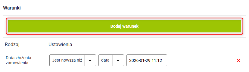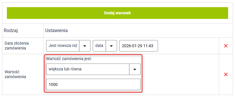 1. Kliknij przycisk Dodaj warunek i z rozwijanej listy wybierz zdarzenie, które ma uruchomić akcję automatyczną (w tym przykładzie: Wartość zamówienia ⇒ Większa lub równa 1000 PLN).