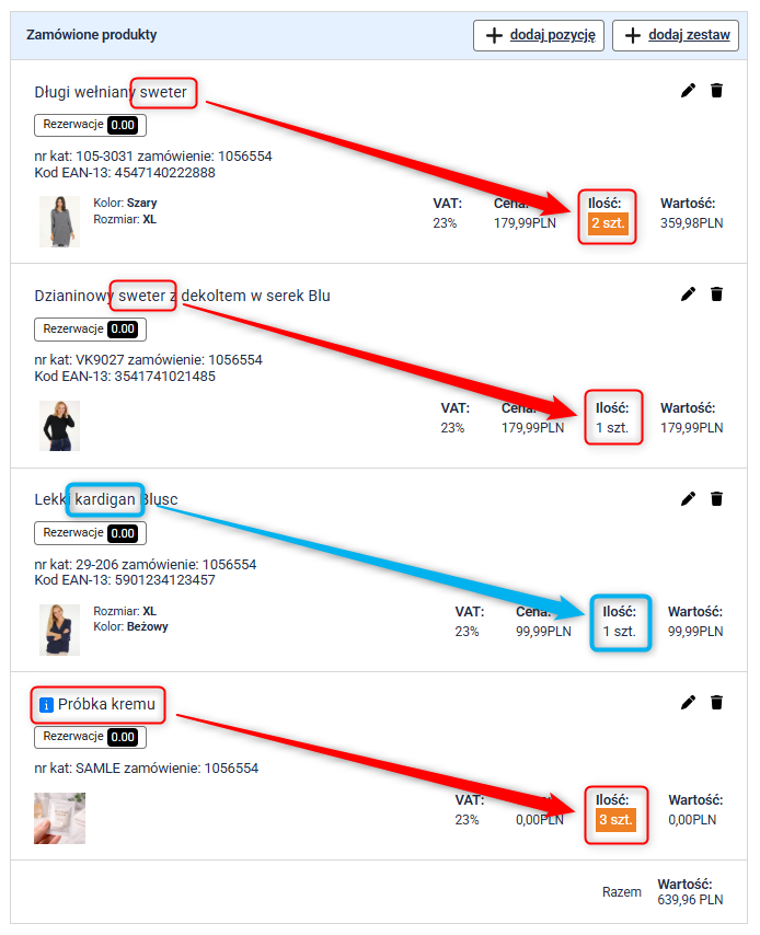 Na potrzeby przykładu przyjmijmy, że w ramach marketingu chcemy dodawać próbkę kosmetyków do każdego zamówionego swetra.