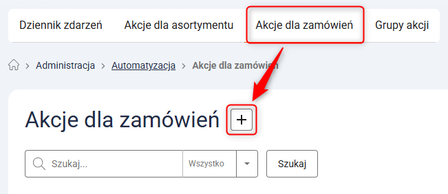 1. Przejdź do Administracja → Automatyzacja → Akcje dla zamówień i kliknij przycisk z ikoną plusa.