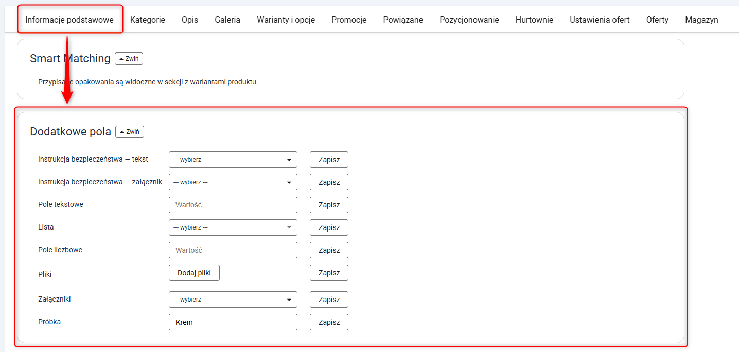 3. Przejdź do Asortyment → Produkty → Wybrany produkt i w zakładce Informacje podstawowe znajdź sekcję Dodatkowe pola.