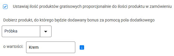 6. Zaznacz checkbox Ustawiaj ilość produktów gratisowych proporcjonalnie do ilości produktu w zamówieniu. Następnie z rozwijanej listy wybierz wcześniej utworzone pole dodatkowe i wprowadź wartość, której system ma szukać w ramach tej akcji.