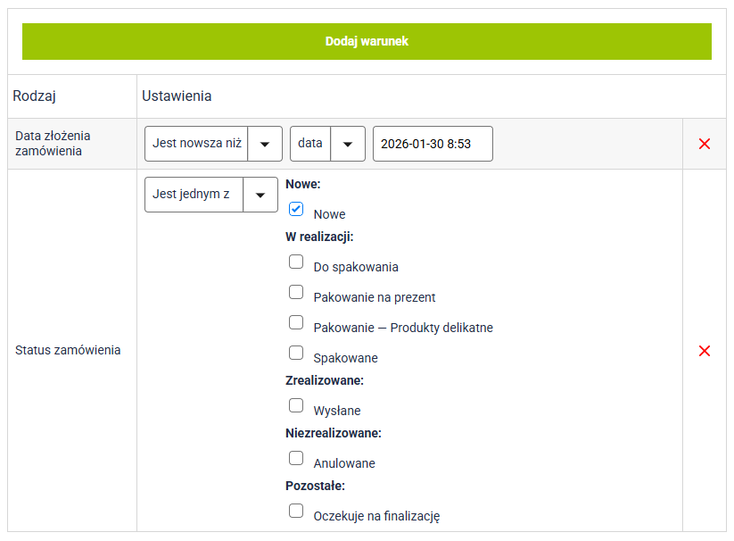 1. Kliknij przycisk Dodaj warunek i z rozwijanej listy wybierz zdarzenie, które ma uruchomić akcję automatyczną (w tym przykładzie: Status zamówienia ⇒ Nowe).