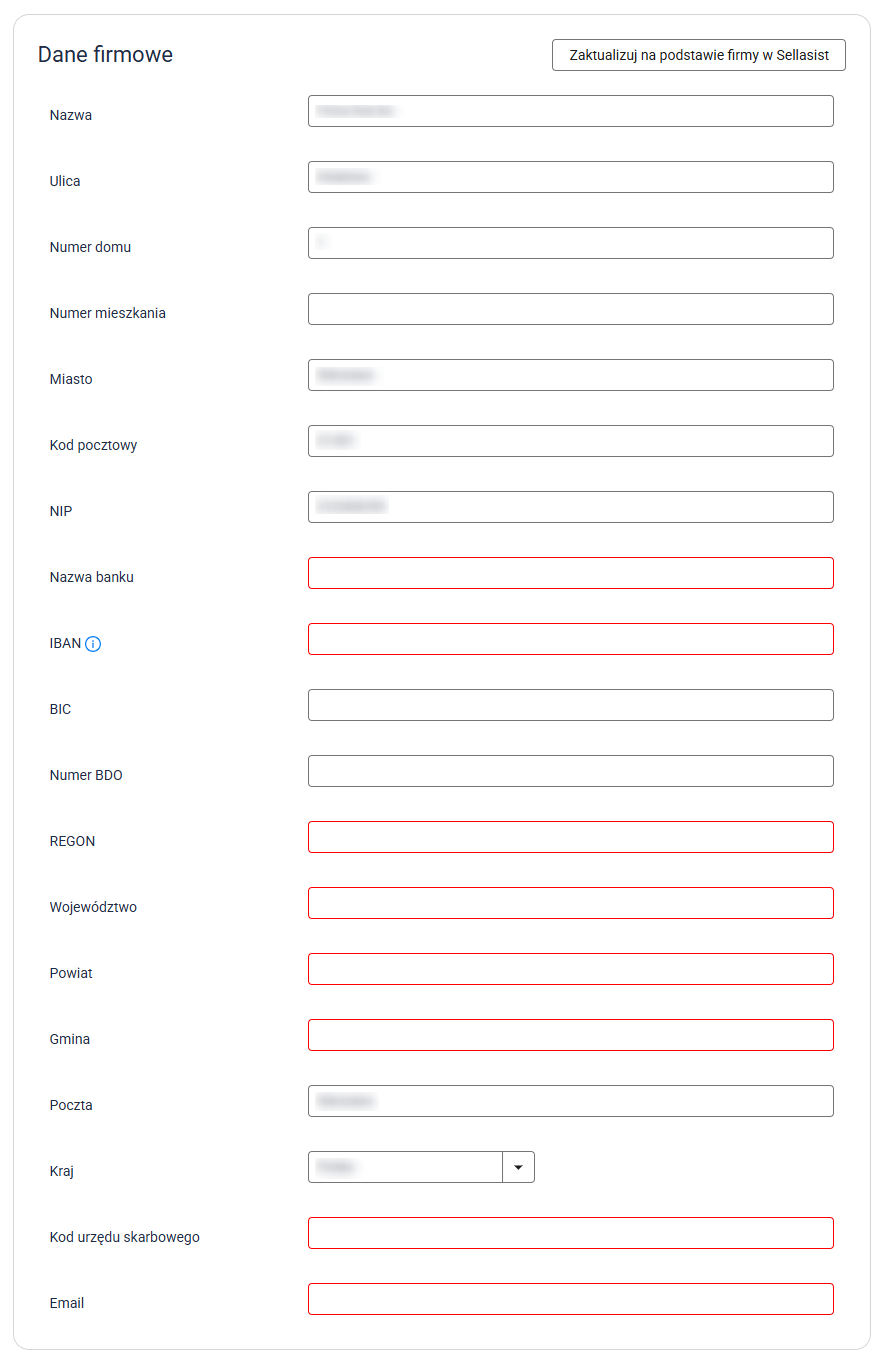 Ręcznie uzupełnij wymagane dane lub — jeśli wcześniej dodałeś dane w zakładce Administracja → Firma — kliknij przycisk Zaktualizuj na podstawie firmy w Sellasist.