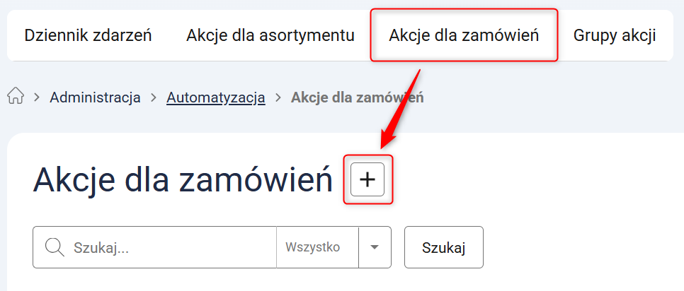 1. Przejdź do Administracja → Automatyzacja, otwórz zakładkę Akcje dla zamówień i kliknij przycisk z ikoną plusa.