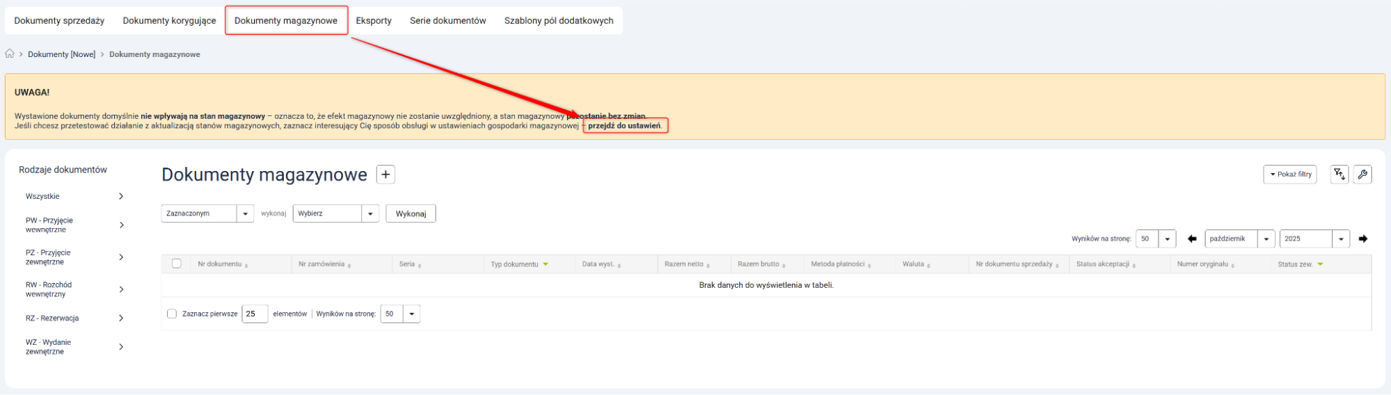 1. W panelu Sellasist przejdź do Dokumenty [Nowe] → Dokumenty magazynowe i kliknij przycisk Przejdź do ustawień.