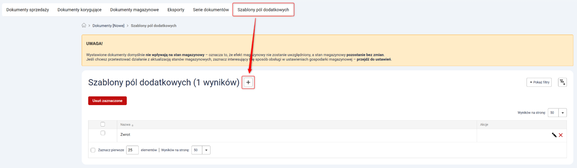 1. Przejdź do Dokumenty [Nowe] → Szablony pól dodatkowych i kliknij przycisk z ikoną plusa.