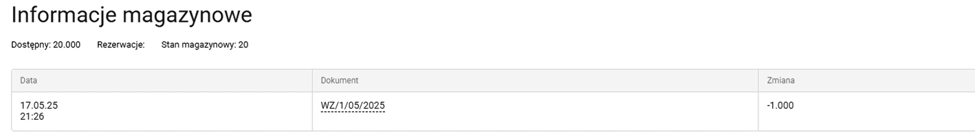 Po kliknięciu przycisku Zobacz listę albo Pokaż informacje magazynowe, możesz sprawdzić wszystkie dokumenty powiązane z danym produktem oraz liczbę sztuk aktualnie zarezerwowanych.