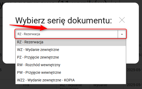 2. Z rozwijanej listy wybierz konkretny typ dokumentu i zatwierdź wybór.