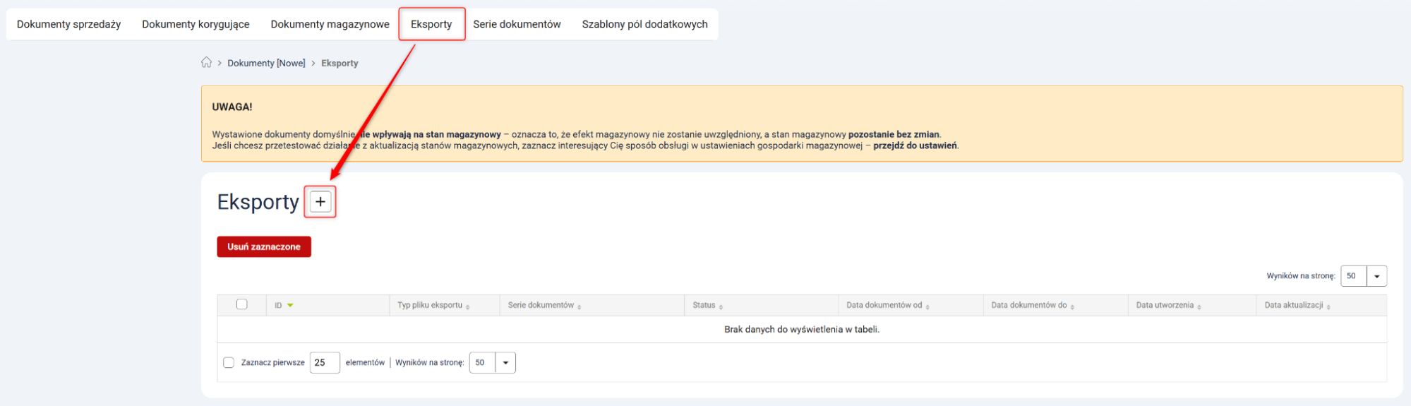 1. Przejdź do Dokumenty [Nowe] → Eksporty i kliknij przycisk z ikoną plusa.