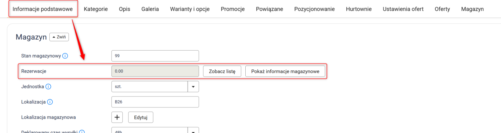 Ta opcja umożliwia rezerwację produktów w magazynie. Po jej włączeniu, w zakładce Asortyment → Produkty → Wybrany produkt → Informacje podstawowe pojawi się informacja o stanie rezerwacji.