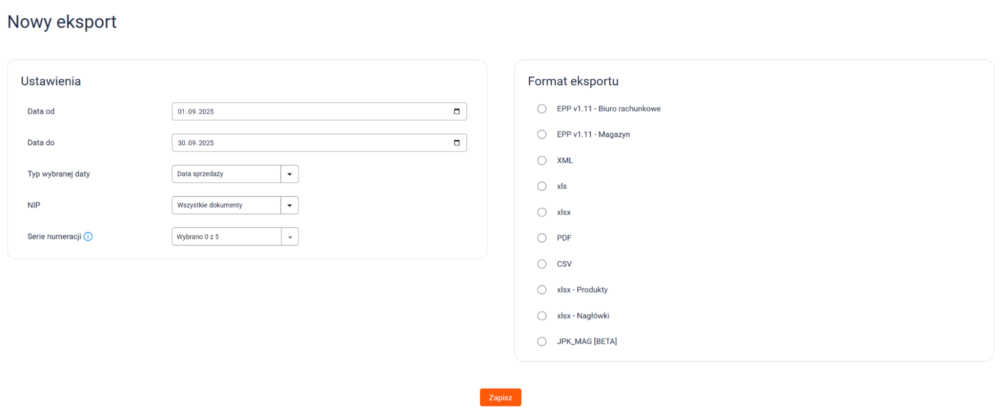 W sekcji Format eksportu wybierz jeden z dostępnych formatów pliku (np. CSV, JPK, EPP) w zależności od potrzeb systemu księgowego lub ewidencyjnego.