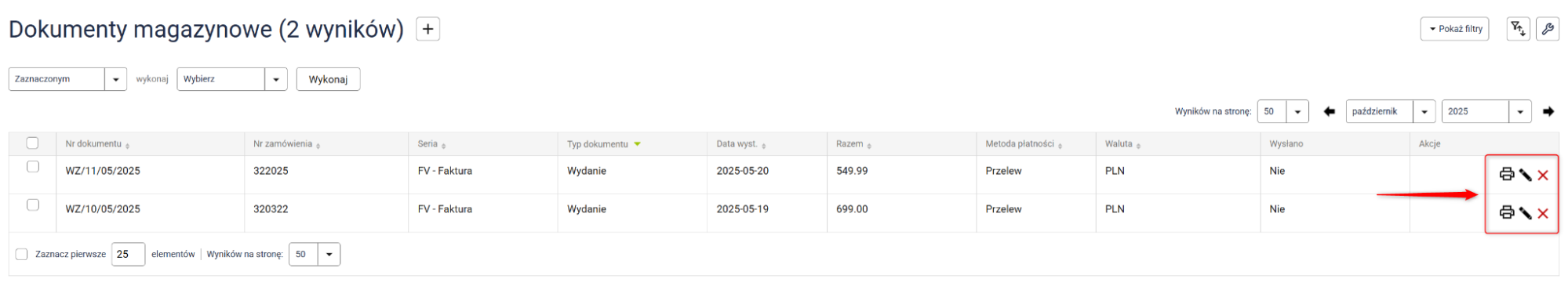 Dokumenty typu Sprzedaż, Korekta i Magazyn wspierają bezpośrednie akcje, takie jak drukowanie, edycja i usuwanie wielu dokumentów jednocześnie.
