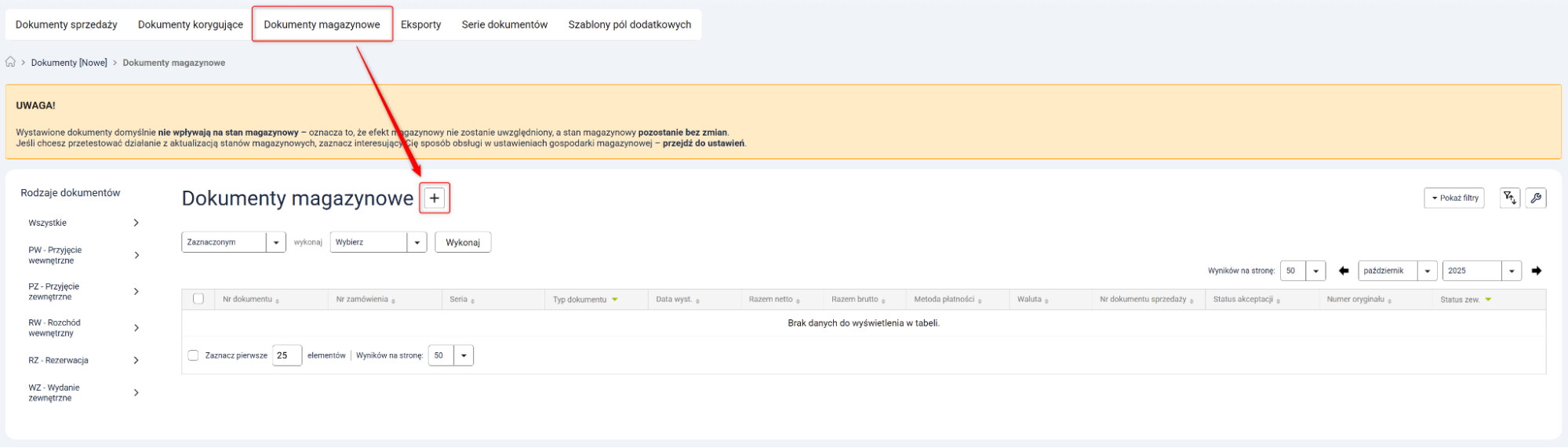1. Przejdź do Dokumenty [Nowe] → Dokumenty magazynowe i kliknij przycisk z ikoną plusa.