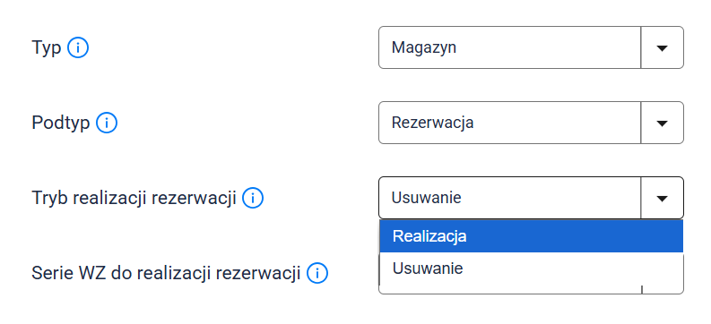 W ustawieniach serii wybierz także Tryb realizacji rezerwacji. Dla zachowania przejrzystości, zalecane jest wybranie trybu Usuwanie, aby po zrealizowaniu rezerwacji system automatycznie usuwał nieaktualne dokumenty i nie gromadził zbędnych wpisów.