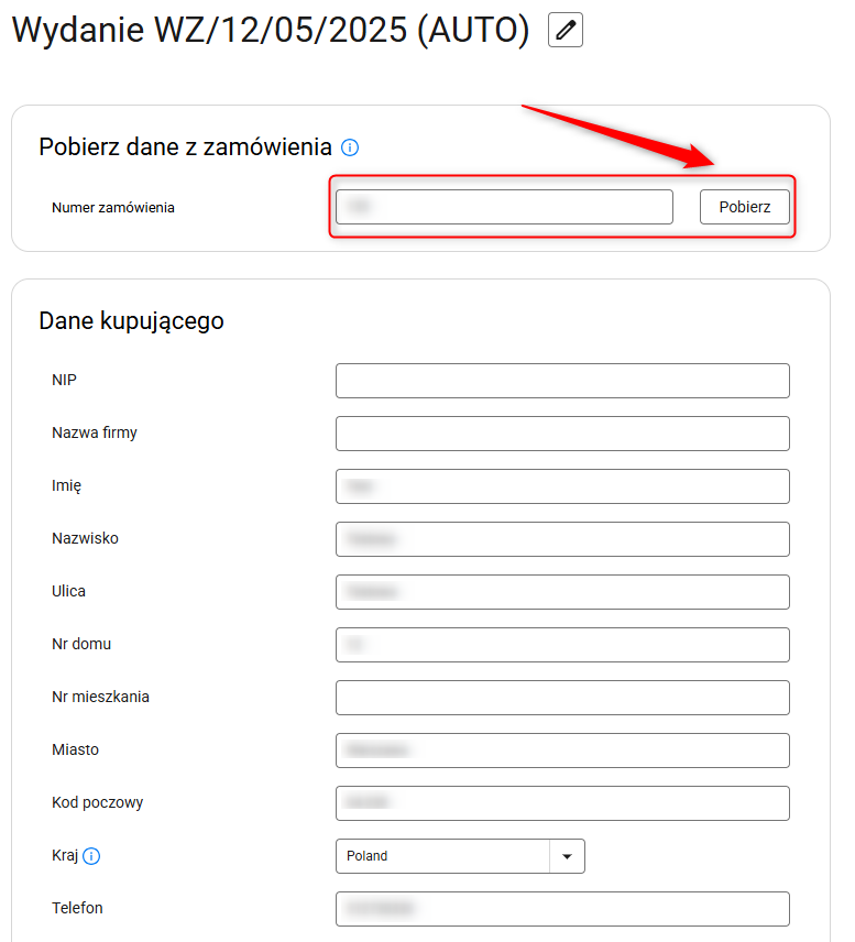 3. W sekcji Pobierz dane z zamówienia wpisz numer zamówienia, dla którego chcesz wystawić dokument, a następnie kliknij Pobierz. Dane z zamówienia zostaną automatycznie uzupełnione, a ewentualne brakujące informacje uzupełnisz ręcznie.