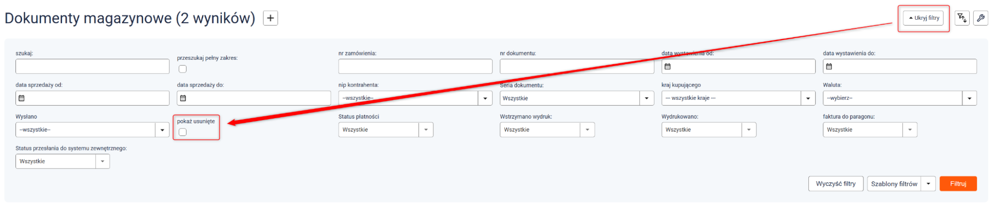 Uwaga: Usunięte dokumenty nie są trwale usuwane — trafiają do archiwum. Aby je wyświetlić, kliknij Pokaż filtr i zaznacz opcję Pokaż usunięte.