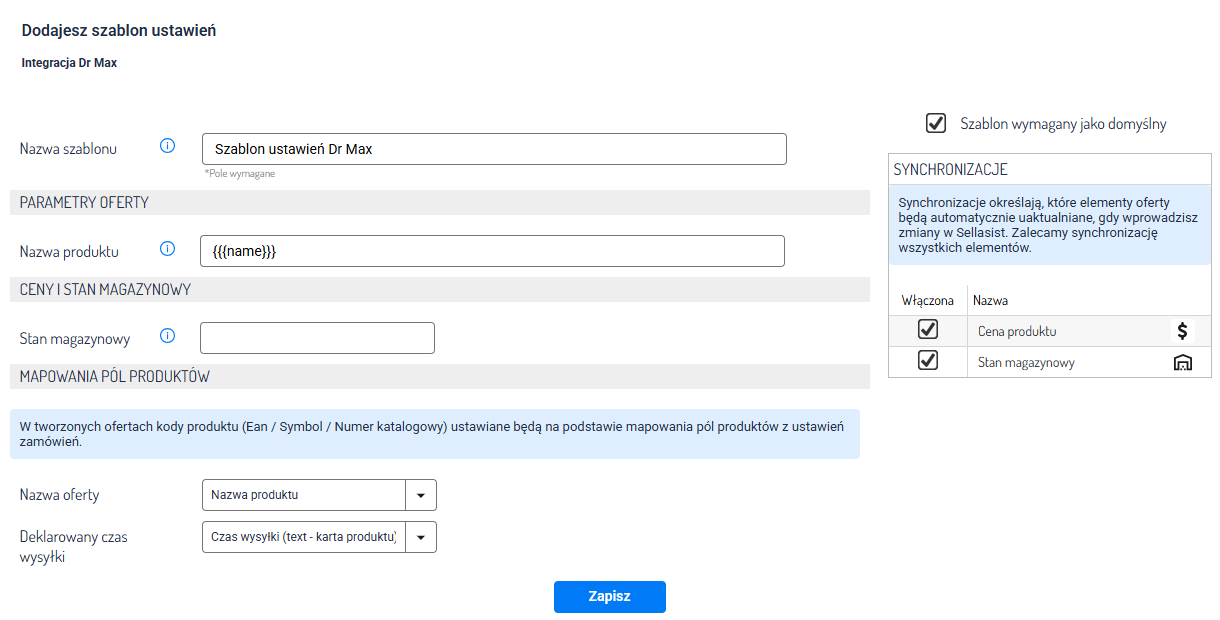 - Nazwa oferty: Mapowanie nazwy z pola Sellasist → Dr Max.