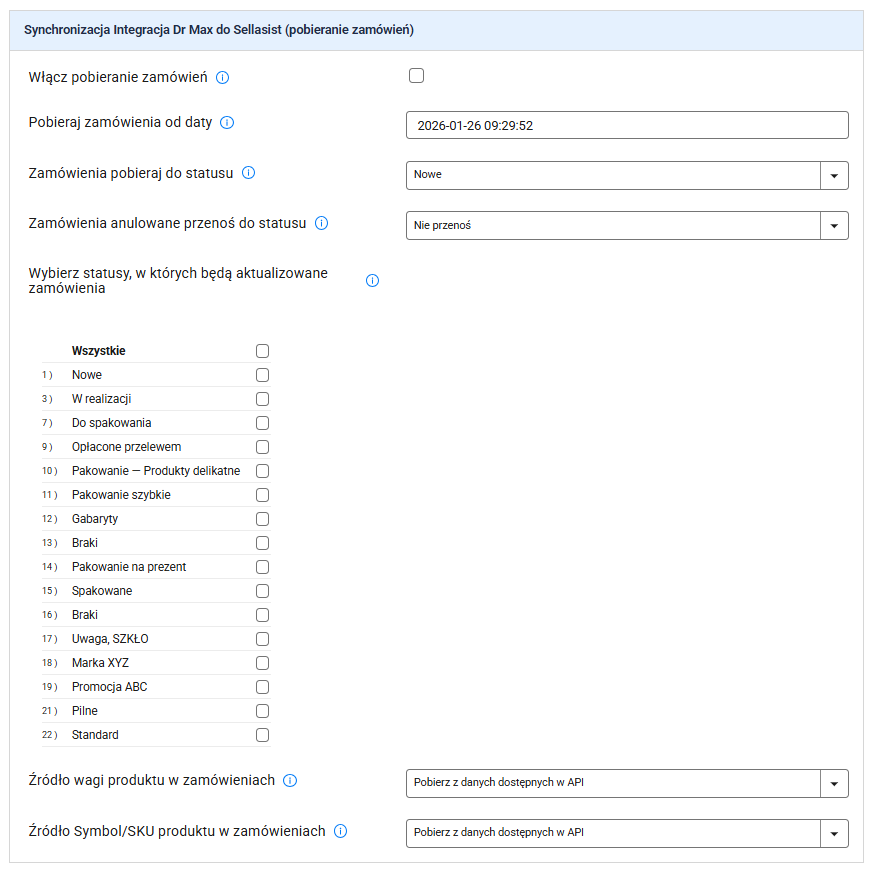 - Aktualizuj statusy zamówień: Aktualizacja statusów zamówień w Dr Max na podstawie statusów w Sellasist.