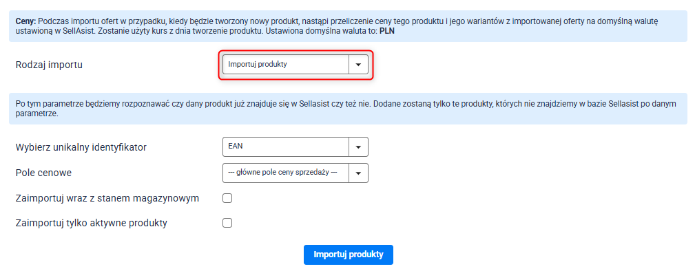 W polu Rodzaj importu wybierz, jakiego rodzaju operację chcesz przeprowadzić — import produktów lub powiązanie produktów. Poniżej znajdziesz instrukcję konfiguracji obu opcji.
