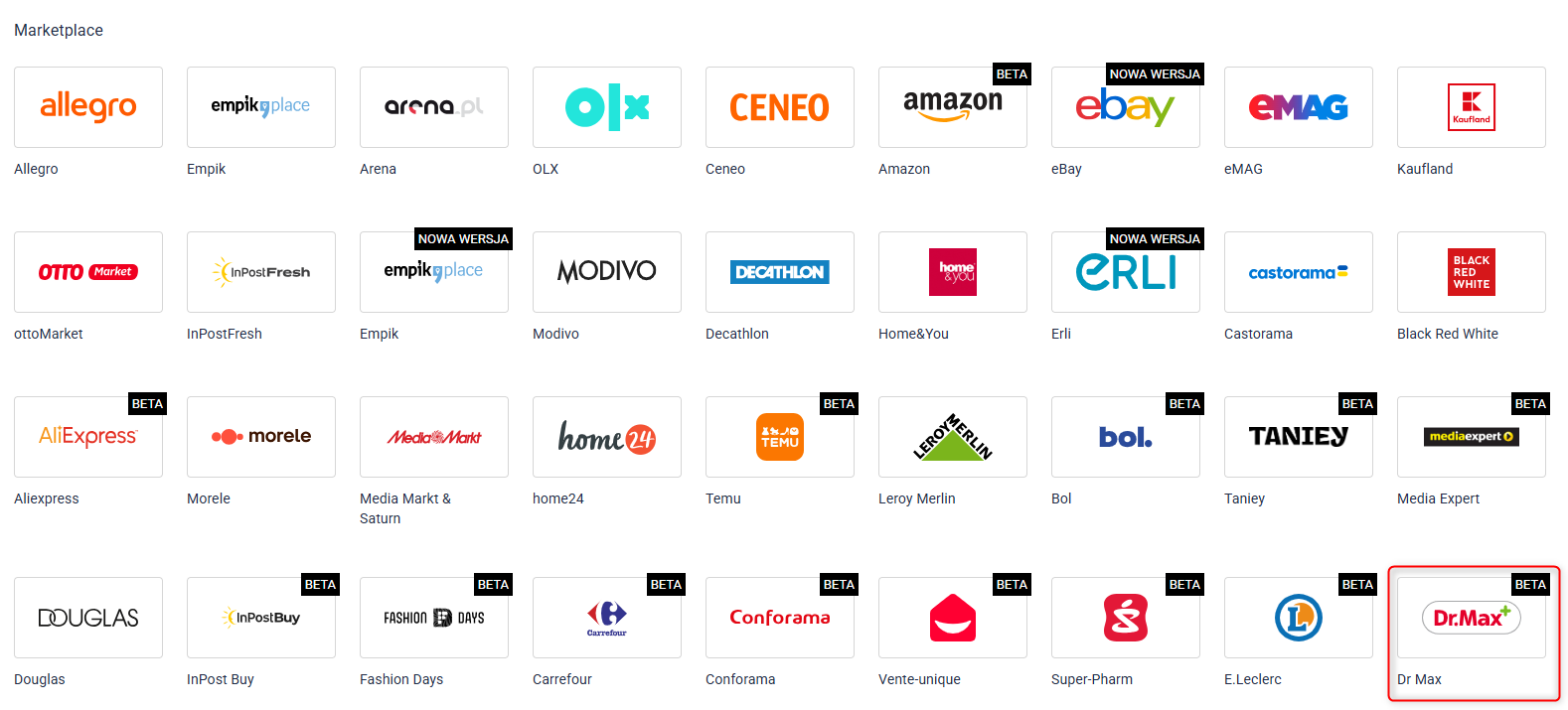 1. Przejdź do Integracje → Dodaj nową integrację i w sekcji Marketplace wybierz Dr Max.
