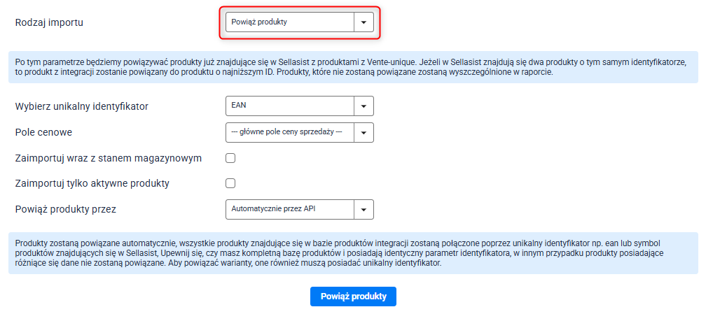 3. Po wypełnieniu formularza — w zależności od wybranej opcji — kliknij znajdujący się na samym dole strony przycisk Importuj produkty albo Powiąż produkty.