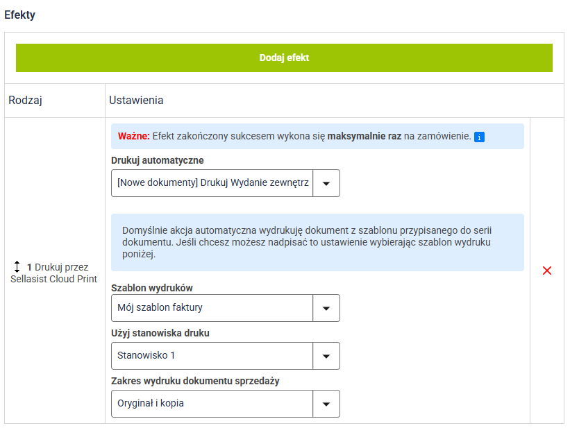 2. Na ekranie zobaczysz okno edycji nowej akcji automatycznej. Skonfiguruj akcję według własnych potrzeb (np. jako warunek ustawiając Dokument wystawiony) i dodaj efekt Drukuj przez Sellasist Cloud Print.