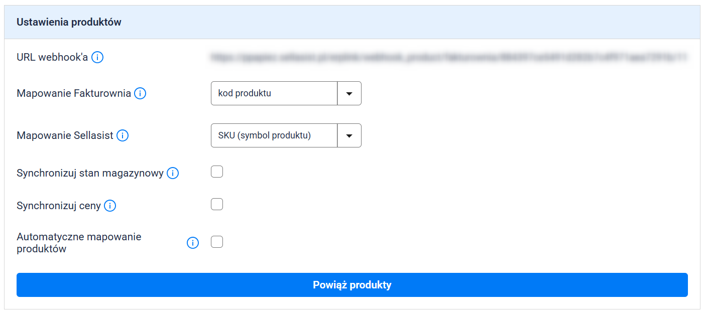 - Mapowanie Fakturownia: Pole produktu z Fakturowni, które będzie używane do dopasowania go z odpowiednim produktem w Sellasist.