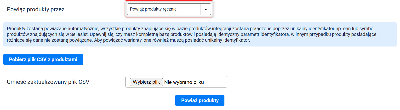 Powiąż produkty ręcznie: Precyzyjne dopasowywanie produktów mogących różnić się identyfikatorami w obu systemach poprzez pobranie pliku z pełnym katalogiem produktów z Sellasist, ręczne wskazanie w dokumencie pozycji do powiązania i ponowne wgranie zaktualizowanego pliku do systemu.