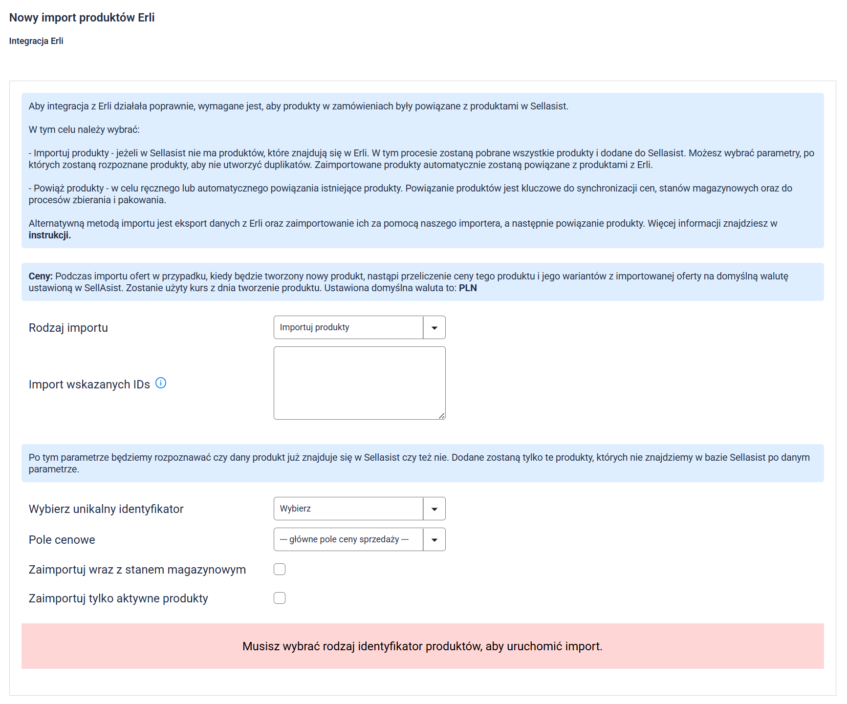 Uwaga: Cena importowanych produktów zostanie przeliczona po aktualnym kursie na walutę domyślną w Sellasist, czyli PLN.