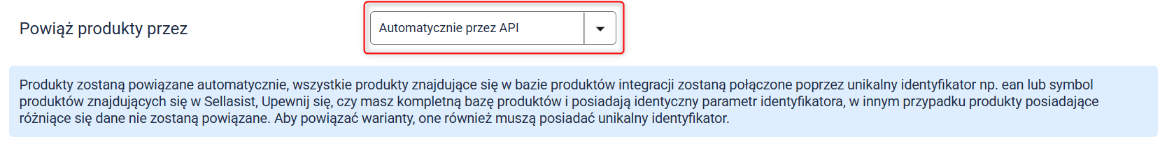 - Wybierz unikalny identyfikator: Parametr, po którym system będzie powiązywał produkty istniejące w Sellasist z produktami na marketplace. Jeśli w Sellasist znajdzie się kilka pozycji z tym samym identyfikatorem, integracja zostanie przypisana do produktu o najniższym ID. Produkty, których nie uda się powiązać, zostaną wskazane w raporcie.
