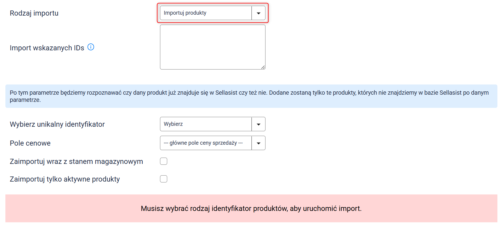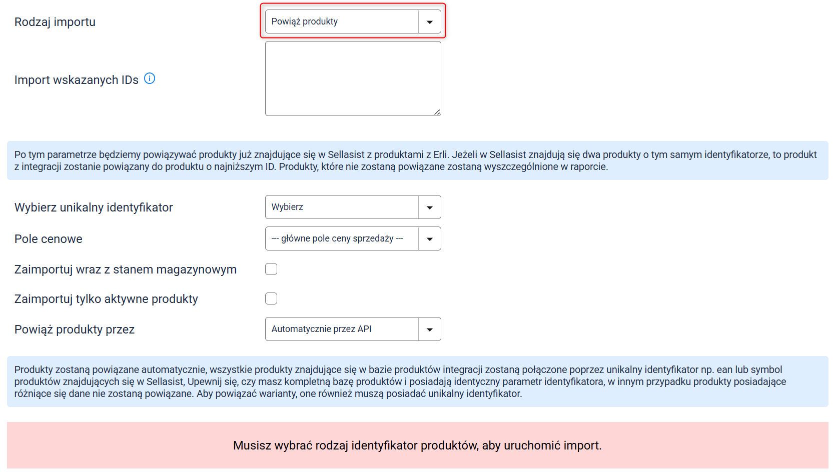 Uwaga: System będzie identyfikował produkty zgodnie z ustawieniami w sekcji mapowań pól produktów. Jeśli zmieniłeś ustawienia domyślne mapowania, uwzględnij zmiany także w tym miejscu.