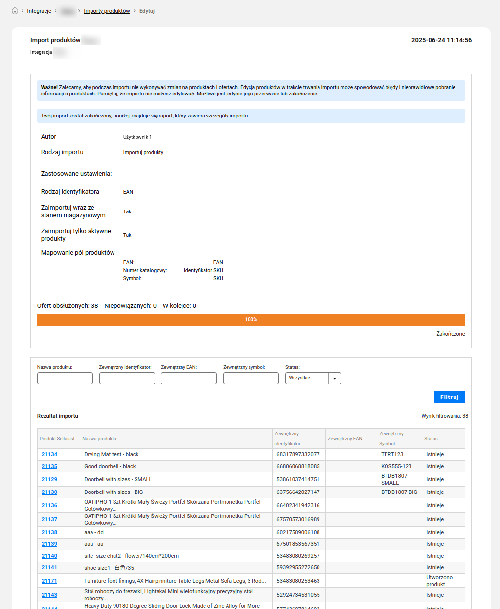 2. Import właściwy: Na podstawie zebranych identyfikatorów system przeprowadza import produktów z pełnymi danymi. Przebieg procesu widać na pasku postępu, a wszystkie działania są zapisywane w logach. W trakcie całego procesu status importu zmienia się kolejno na: W trakcie przygotowania ⇒ Gotowy do importu ⇒ W trakcie.