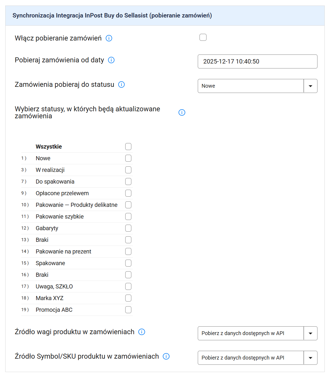 - Aktualizuj statusy zamówień: Aktualizacja statusów zamówień w InPost Buy na podstawie statusów w Sellasist.